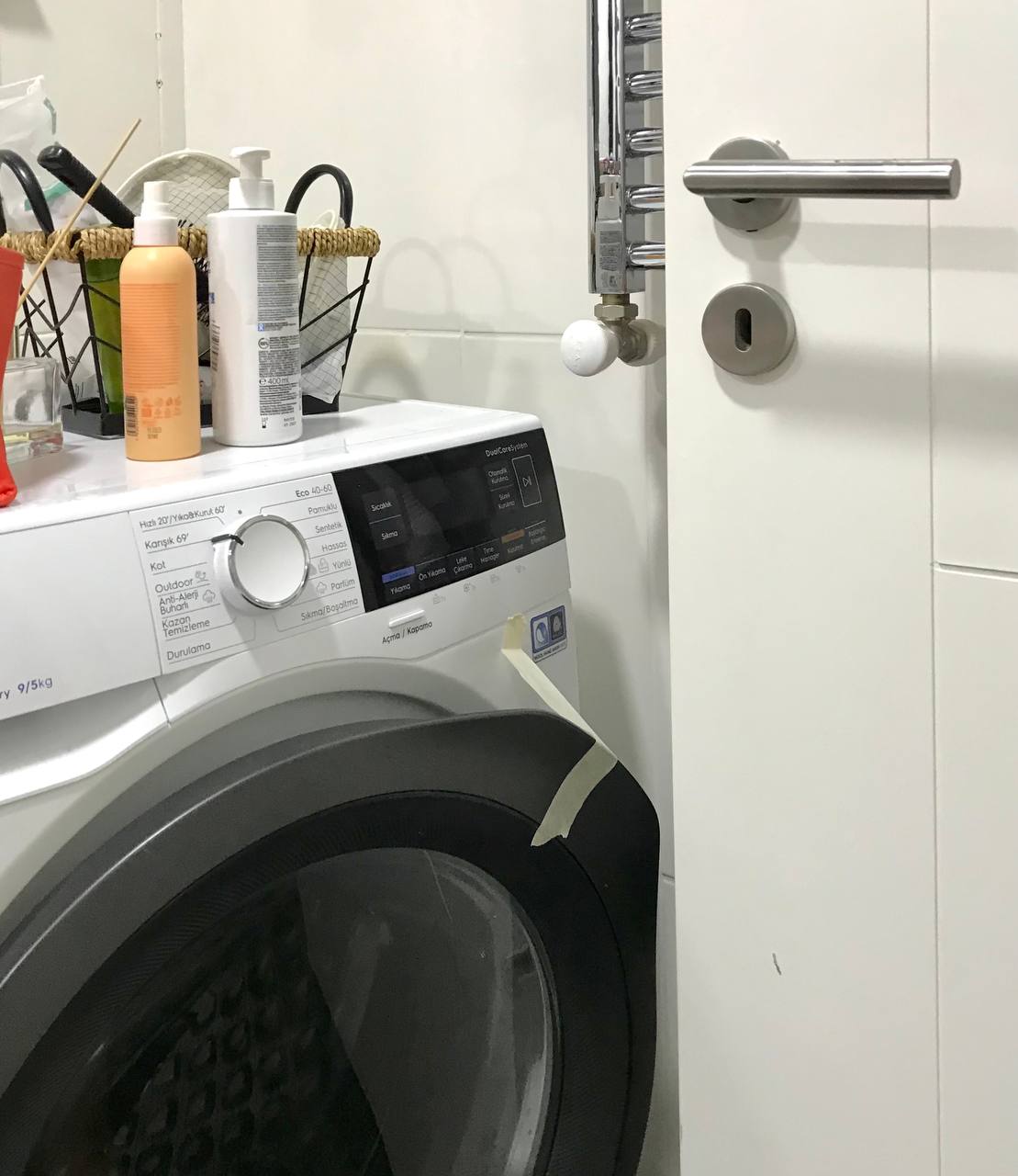 С закрытой дверцей машинка запревает, а с открытой распахивается до конца. Еще дверца врезается в межкомнатную дверь и сдирает с нее краску. И самое страшное — перекрывает дорогу к унитазу. Поэтому мы ее фиксируем скотчем.