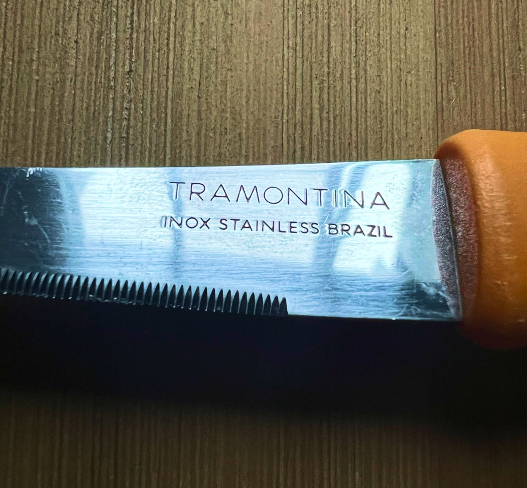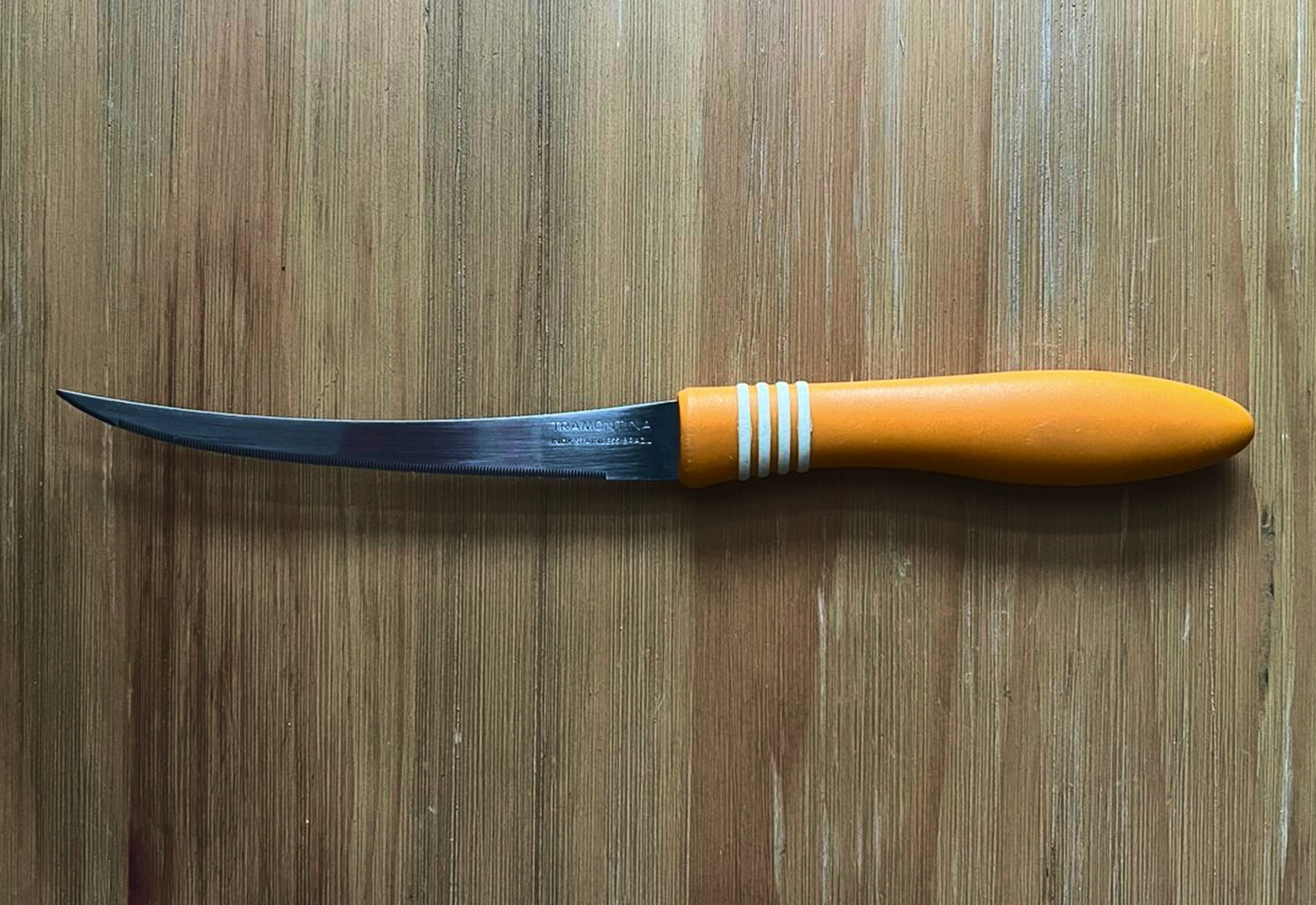 Такие ножи делает Tramontina, бразильская компания, основанная в 1911 году. Ее цель — делать рабочие, удобные и долговечные инструменты, не задирая цену. И делают же! Используют качественную нержавеющую сталь (часто AISI 420). Делают эргономичную ручку из ударопрочного ABS-пластика, устойчивого к температуре и влаге. Фишка ножей в полном хвостовике — сталь проходит через всю рукоять, из-за чего нож крепкий.