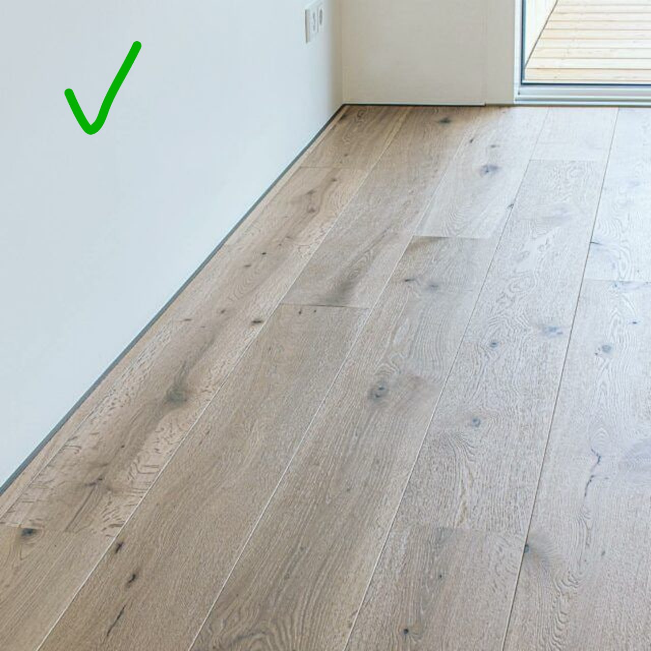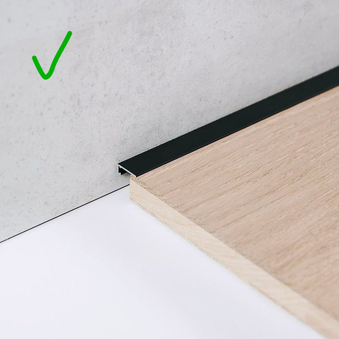 Между напольным покрытием и стеной нужен технологичный зазор, чтобы у материала была возможность расширяться и сжиматься при изменениях температуры и влажности. Для инженерной доски и напольных покрытий, которые не крепятся к полу (ламинат, паркетная доска с замковым соединением) — 5-7 мм. Для штучного паркета и доски — 8-12 мм. Для линолеума — 5-10 мм. Зазор можно прикрыть г-образным профилем: