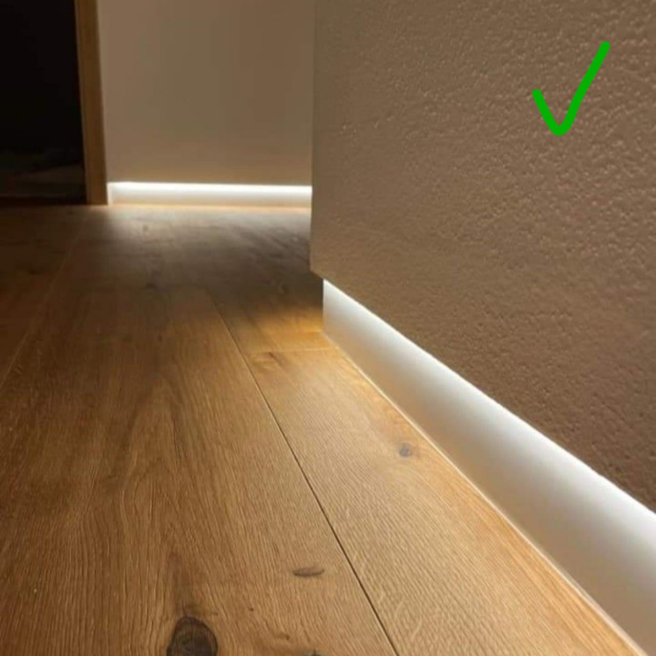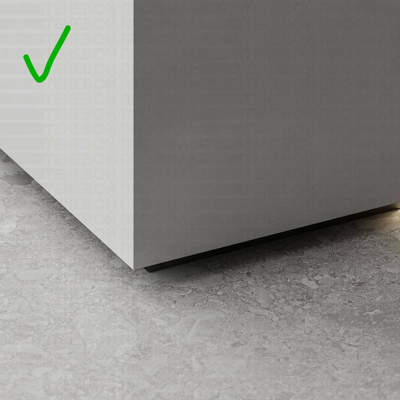 Он тоже на металлическом профиле, но уже без самого плинтуса, создает ощущение парящей стены. Пыль не собирает и подсветку можно встроить — кайф. Стандартная высота зазора — 2 см, можно делать и меньше если уборкой занимается робот-пылесос, обычный пылесос в щель не пройдет: