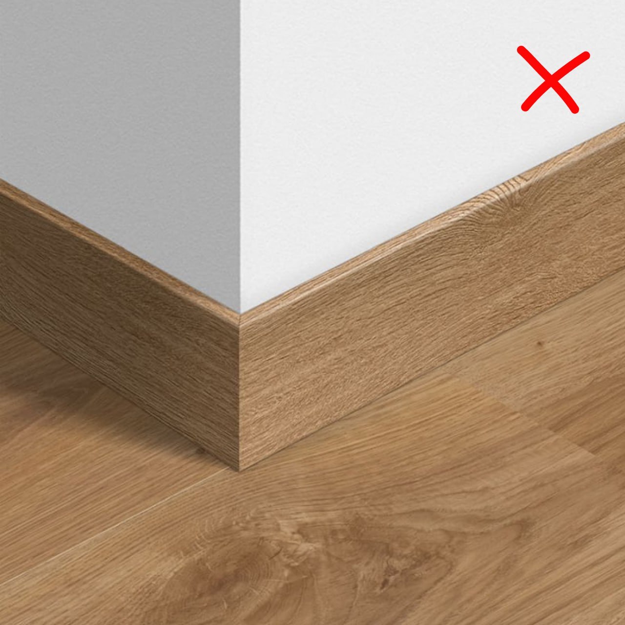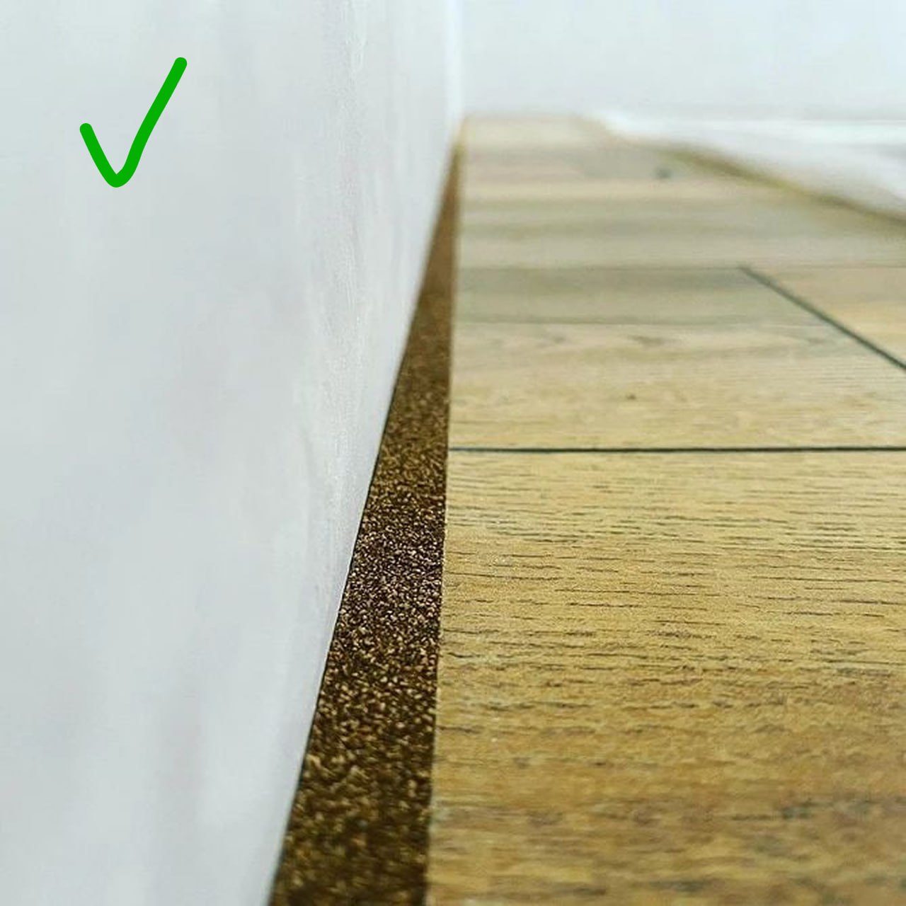 или заполнить пробковым компенсатором, или герметиком, соответствующим покрытию. Вариант подходит только для идеально ровных стен и аккуратных рук мастера. Компенсатор и герметик лучше подбирать в тон или чуть темнее пола:
